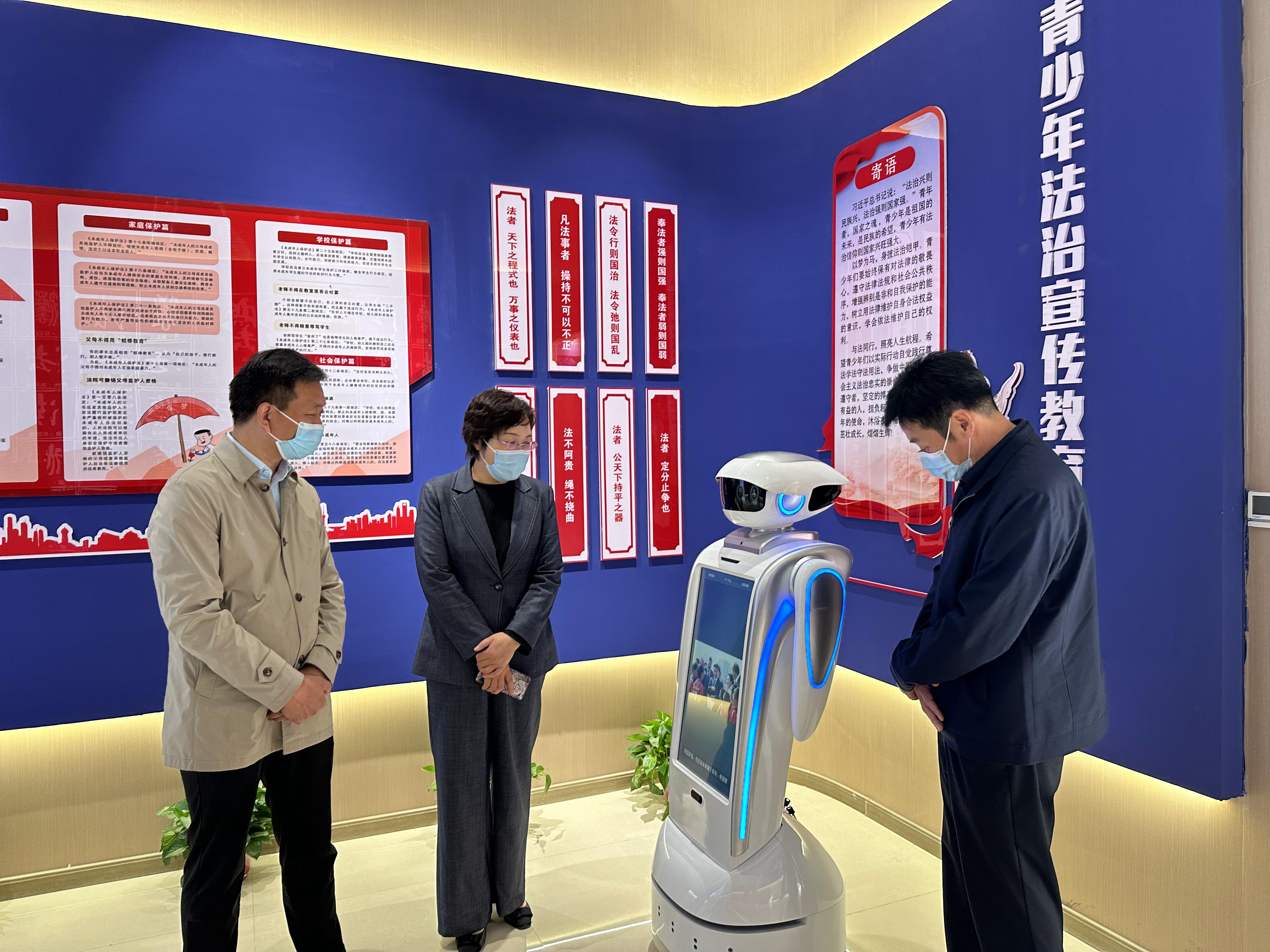 在可爱的机器人“法宝”及义务讲解员的引导下,考察组一行先后参观了法治走廊、法治窗帘、心理咨询室、宣泄室、法治教育实践区等场所。大家边听介绍边看成果,并时而提出问题、交流经验,全面系统地了解了周口市青少年法治教育中心的设计理念、布局规划、硬件设施、运作模式和实际成效等情况。