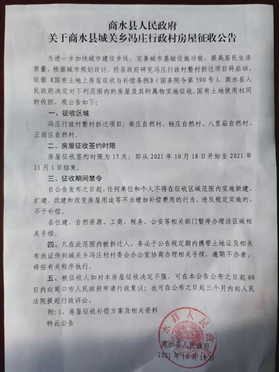 商水县人民政府关于商水县城关乡冯庄行政村房屋征收公告